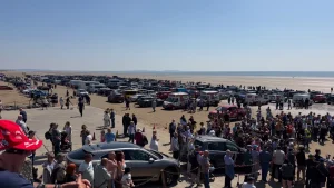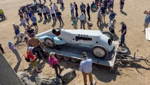 But the return of the original car to the famous venue to celebrate the centenary of the world record turned into a sun-kissed jamboree. Around 3,000 people flocked to the beach to see Geraint Owen, Son of the man who dug up ‘Babs’ 42 years after she had been buried in the sand dunes in the wake of her deadly crash, take her for a trip down memory lane.